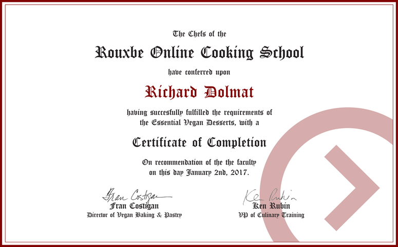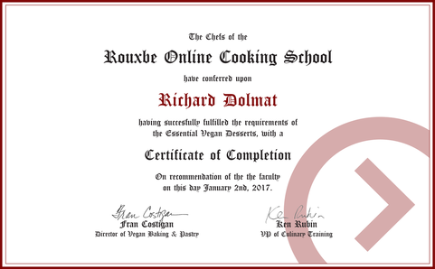 I took Fran’s “Vegan Baking Bootcamp” in 2016. Fran built a thorough curricula of baking techniques ranging from gels, creams, and puddings through cookies, cakes, and pies. All of her recipes were well tested and easily understood, resulting in thoroughly satisfying deserts that I would match up against any traditionally baked competition. In addition to the recipes, Fran taught important baking skills such as choosing sweeteners, testing your components, working with chocolate, and plating and decorating in an appealing manner. I am a much better baker thanks to Fran’s class, and was motivated to expand my cooking education through Rouxbe's online platform.